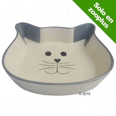 Precioso comedero con forma de cara de gato y orejas grises, muy llano para facilitar la ingesta de comida, con parte inferior rugosa para asegurar la estabilidad. Color: gris.
